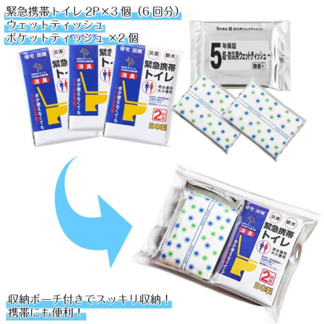 <セット内容> 緊急携帯トイレ2P×3(計6回分)、ウェットティッシュ 除菌+(20枚入り)