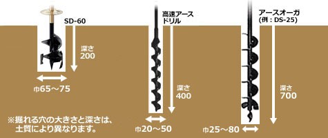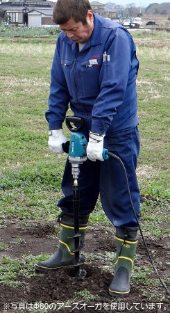 低速(毎分600回転)・高トルク型で、負荷が大きい土の穴掘りでも十分にご使用いただけます。
