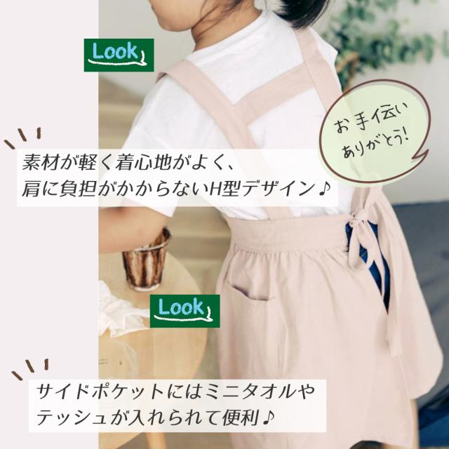 | 主な仕様 | カラー:ネイビー/ライトグリーン/ブルー/ピンク ※画面上と実物では、多少色具合が異なって見える場合がございます。 素材:ウオッシュドコットン サイズ:長さ約58cm(ショルダーストラップを除いた部分)/ 胸前幅約23cm 裾幅約102cm 目安: 3歳〜7歳、身長約100cm-120cm 同デザインの大人用エプロンも取り扱っております。 ※若干のサイズ誤差はご容赦ください。 |