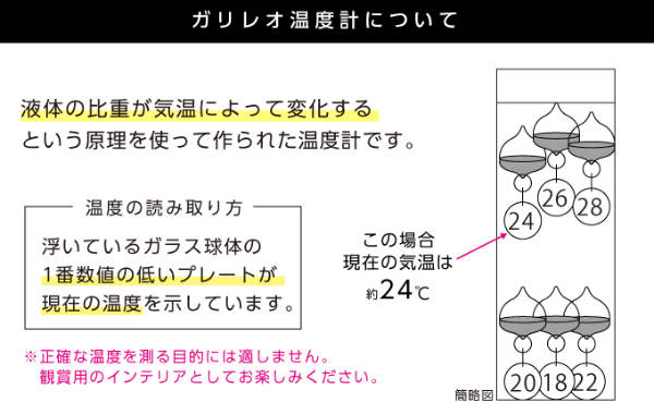 ※ガリレオ温度計は正確性に劣ります。あくまでインテリアとしてお楽しみください。※直射日光が当たる場所には設置しないで下さい。太陽光などの光をレンズ効果で1点に集める可能性があります。※別途費用で名入れができます。版代等別途お見積致します。ご興味のあるお客様はお気軽にお問い合わせください。
