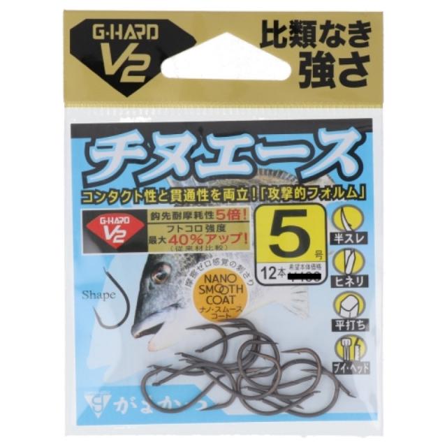【がまかつ/Gamakatsu】高強度・高硬度・耐摩耗性に優れた新素材「G-HARD V2」搭載により、驚異の鈎先耐久性とフトコロ強度を備えたチヌエースは、磯や魚との度重なる接触や、鈎先が傷みやすい底を這わせる釣りにおいて鋭さが持続するのが最大の特徴。