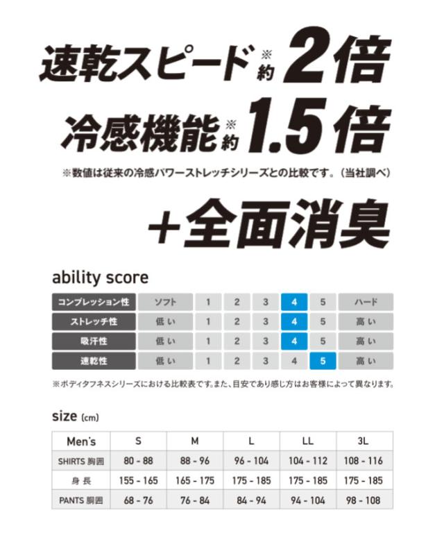 耐久繊維コーデュラ®+ライクラ®freshFX®を採用した BODY TOUGHNESS 史上最高の冷感・速乾・消臭のパワーアップモデル!従来の冷感パワーストレッチシリーズに比べ、速乾スピードはなんと約2倍!冷感機能約1.5倍!!さらに全面消臭!