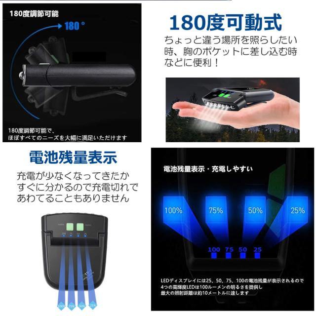 LEDキャップライト 2個セット ヘッドライト 角度調整可能 懐中電灯 USB充電 電池残量表示 クリップ付き 帽子ライト 帽子 キャップ アウトドア 釣り軽量 KURIP