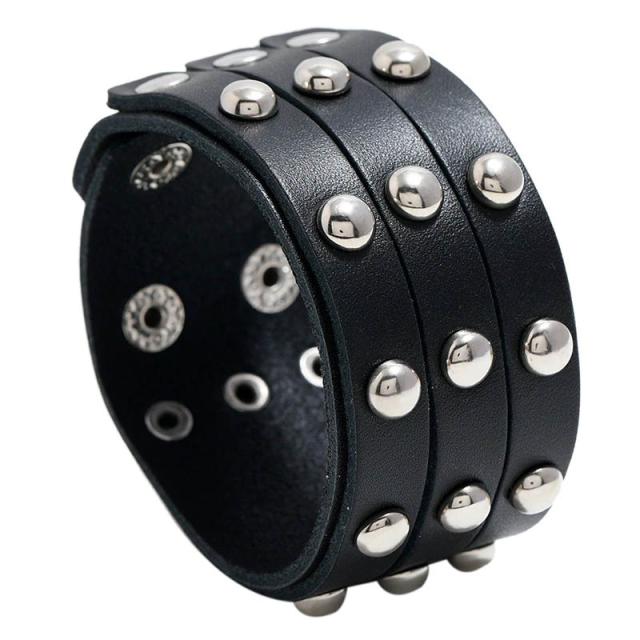 黒色ブラックのワイドなブレスレットに半球型のドームスタッズを打ち込んだ鋲をセットした細身のレザーを3個並べたまるで3連風のロックな皮製のレザーブレスレットを着けているように見える人気のアイテム。