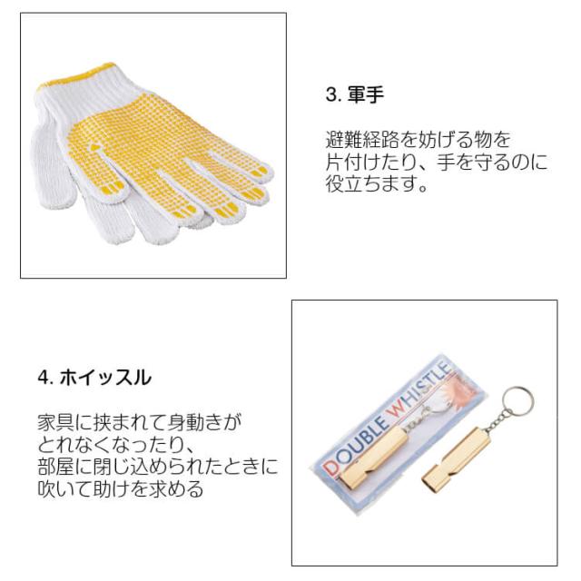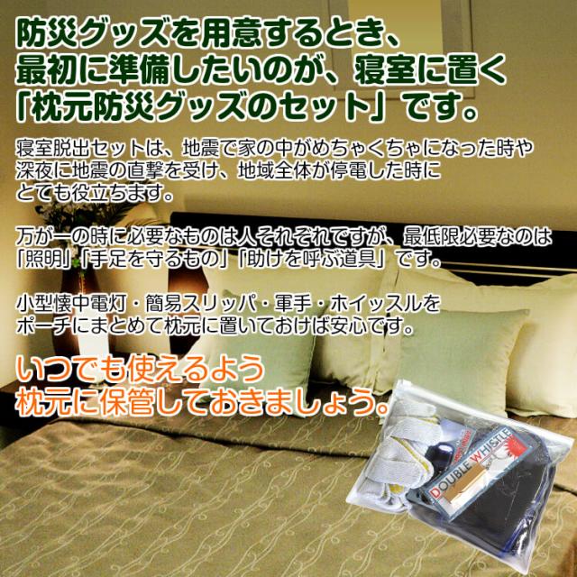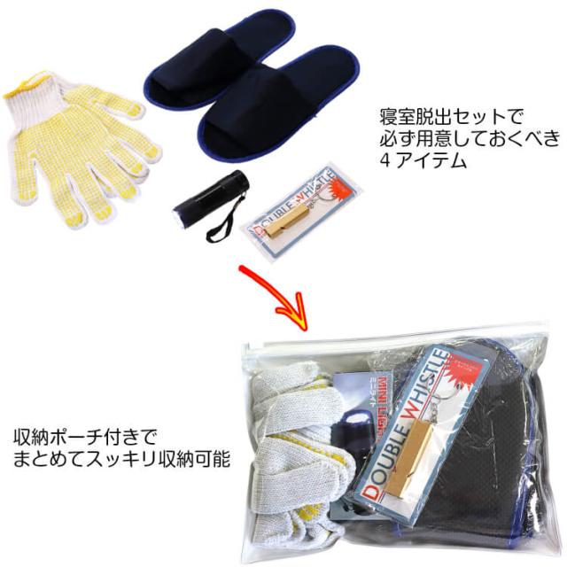 小型懐中電灯・簡易スリッパ・軍手・ホイッスルをポーチにまとめて枕元に置いておけば安心です。