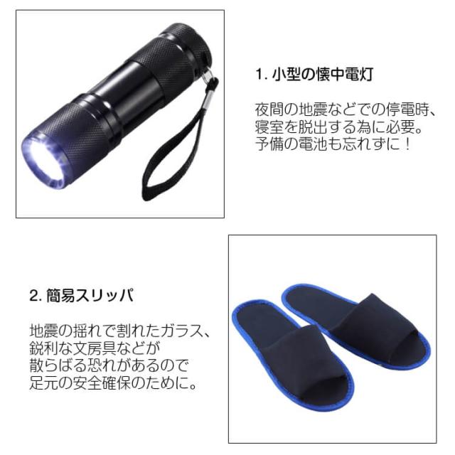 夜間の地震などでの停電時、寝室を脱出する為に必要。予備の電池も忘れずに!