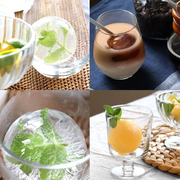 氷の中にライムやミントを入れたり、ジュースを凍らせてまん丸シャーベットを作ったり。また、コーヒーを凍らせておいて、冷たい牛乳を注げばいつでも手軽に冷たいカフェオレが楽しめます。様々な使い方ができるのでパーティーにもぴったりです。