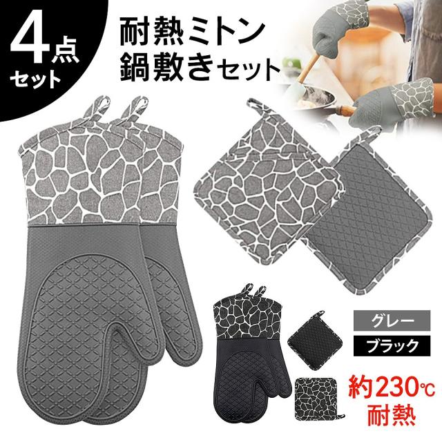 鍋つかみ 鍋敷き ミトン シリコン 4点セット 耐熱 シリコン 鍋つかみ 耐熱鍋敷き なべつかみ やけど防止 洗える キルト オーブンミトン バーベキュー 高温対応 agesugi_snk