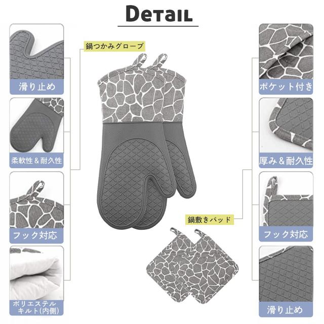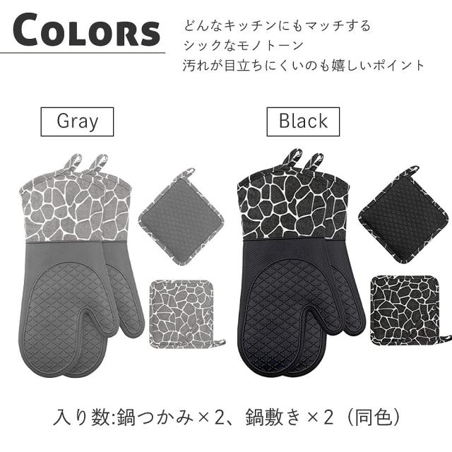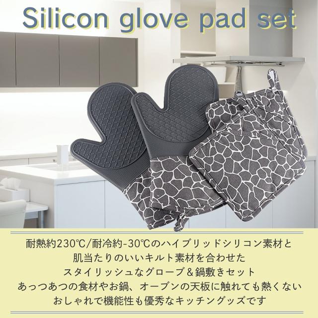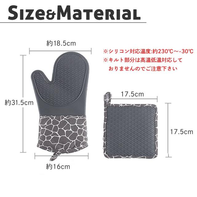 シリコン製/耐熱約230℃・耐冷性約-30℃の本格派キッチン鍋つかみグローブ&鍋敷きのセットです。