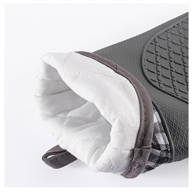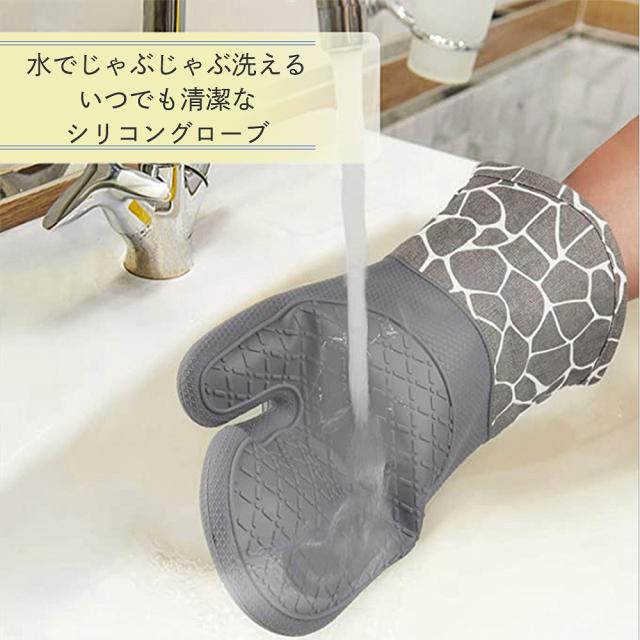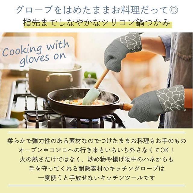 耐熱性・耐冷性のあるシリコン素材なので、アツアツの食材やオーブンの天板を触ることが出来、また柔軟性・耐久性もあるのでつけたままあらゆる作業をこなすせるので料理の効率もアップ。