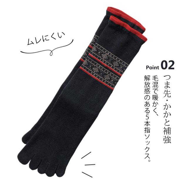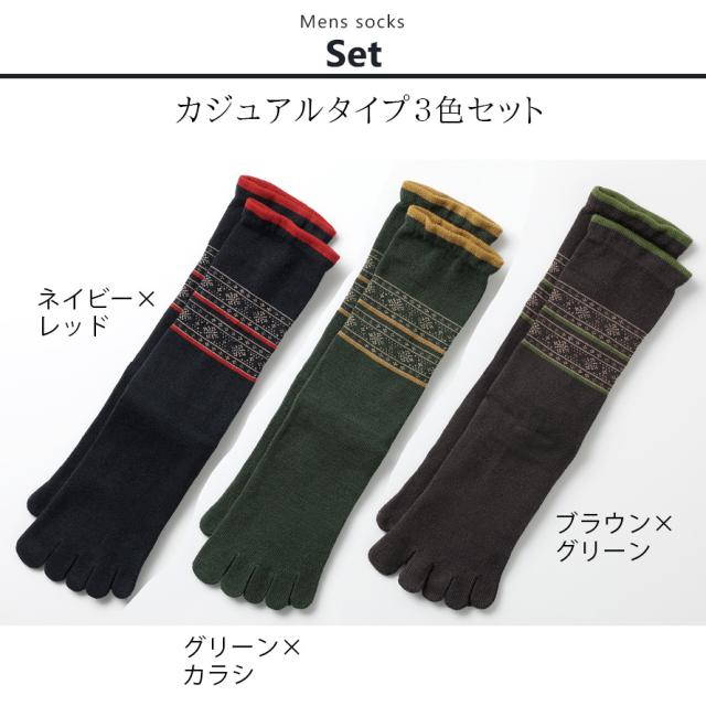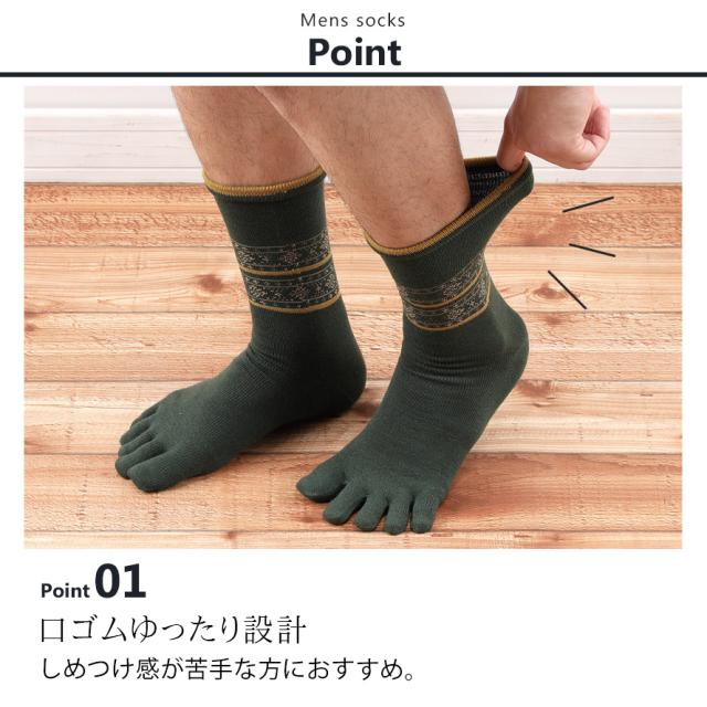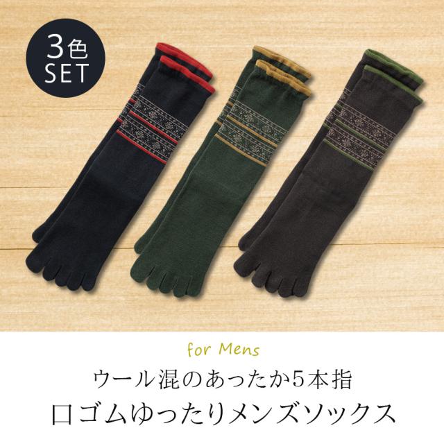 五本指ソックス メンズ 3足組 25-27cm 靴下 ウール混 冬 あったか 暖かい 秋冬 5本指 五本指 ムレにくい 履き口 口ゴム ゆったり クルー丈 カジュアル 柄 北欧 ノルディック柄 男性 ゆったりあったかメンズ5本指ソックス
