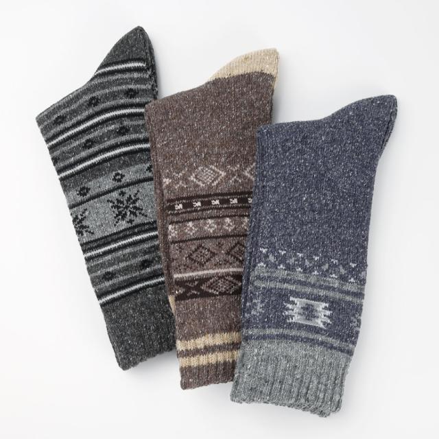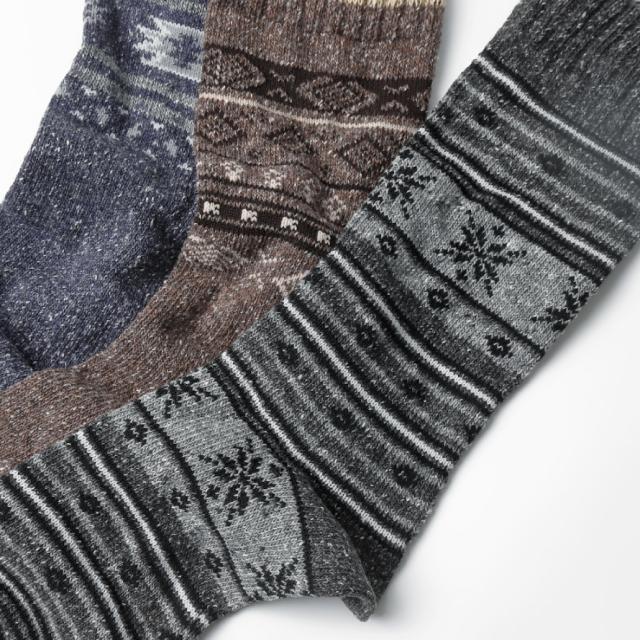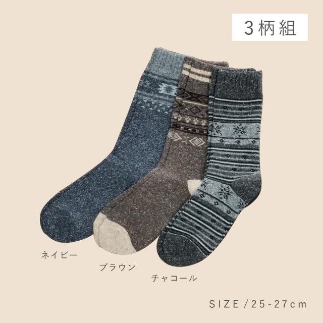 靴下 メンズ 3柄組 25-27cm 冬 あったか 暖かい 秋冬 吸湿発熱 発熱素材 履き口 口ゴム ゆったり クルー丈 ロング 丈長 カジュアル 柄 北欧 フェアアイル柄 日本製 男性 つま先・かかとあったかネップメンズソックス