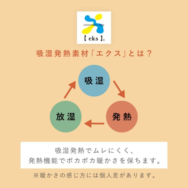 つま先とかかと部分には、吸湿発熱素材「エクス」を使用。冷えやすい足先をしっかり温めながら、湿度を整える「調湿機能」と、自ら熱を生む「調温機能」で、ムレにくく快適なあたたかさをキープします。秋冬の冷え対策にぴったりの靴下です。
