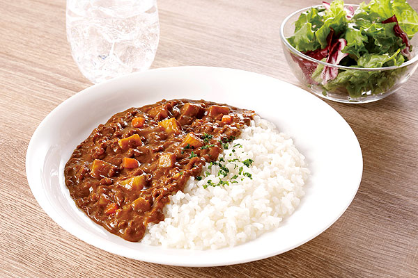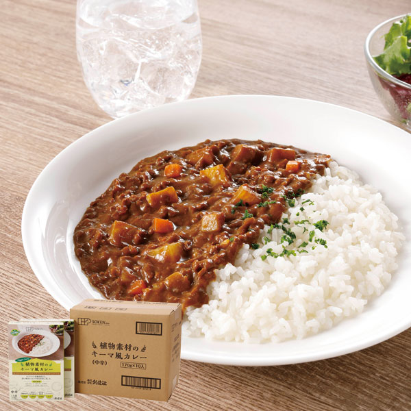 国産大豆から作った大豆ミートを挽肉状にし、植物素材だけで深い味わいとコクを引き出したキーマ風カレー。国産野菜、国産小麦の小麦粉、圧搾製法のべに花油使用。(レトルト・中辛)