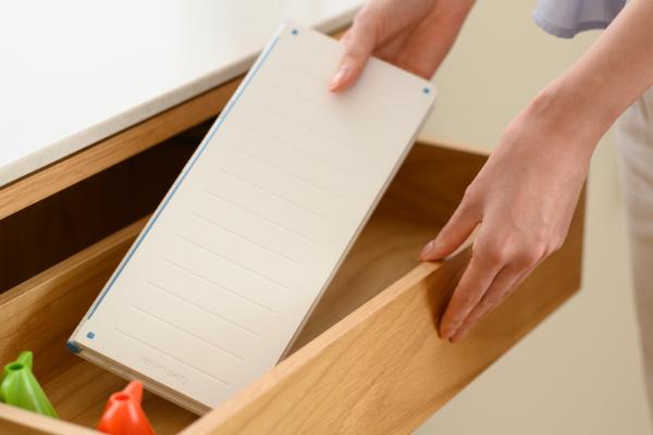 専用フォルダーを使用して自立することができるのでキッチンを広く使うことができ、まな板が2つ折りのスリムな形状になるので省スペースに収納することができます。使用するときはフォルダーからスムーズに取り出すことができます。