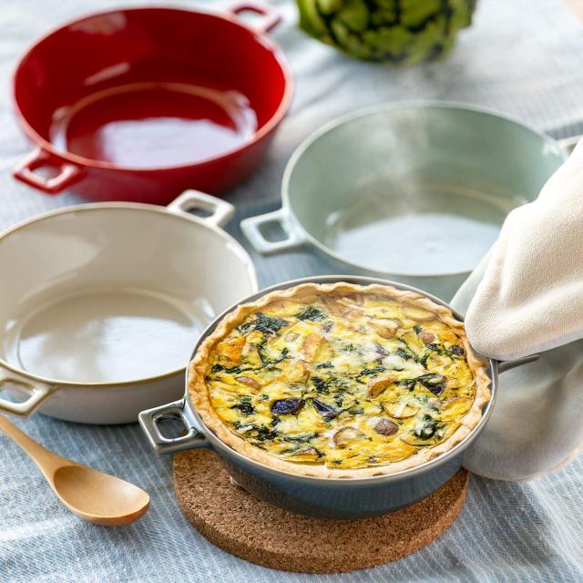 グラタン、ドリア、ラザニアなどのオーブン料理を、オーブンから出してそのままテーブルに出せるグラタン皿です。オムレツやキッシュなどの卵料理や魚のオーブン焼きなどにも便利です。ほっこりとしたデザインに浸りながら、出来立て熱々のお料理を味わえます。