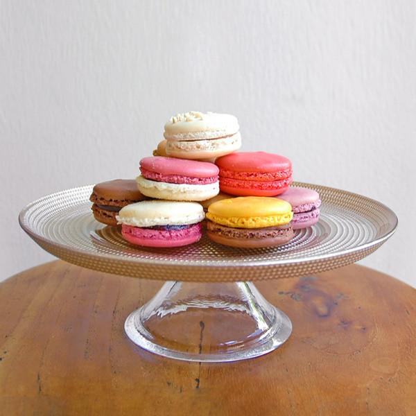 シンプルな台座に傷が目立ちにくい模様を施したガラス製のコンポートです。マカロンやクッキーなどの小さなお菓子や、フルーツなどを盛り付ければ、テーブルがもっと華やかに。また、アクセサリートレイとして、お部屋に飾っても素敵です。