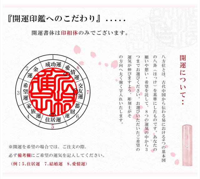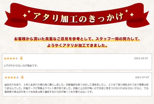 - 注文してから届くのも早かったですし、印鑑もケース(3Dフラワー桃)も綺麗で満足しています。アタリはアメジストにしましたが、これも綺麗で気に入っています。ありがとうございました。