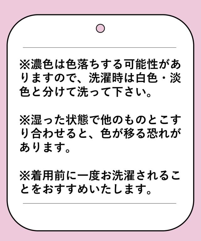※濃色は色落ちする可能性がありますので、洗濯時は白色・淡色と分けて洗って下さい。※湿った状態で他のものとこすり合わせると、色が移る恐れがあります。※着用前に一度お洗濯されることをおすすめいたします。