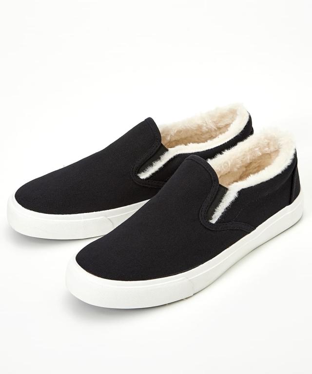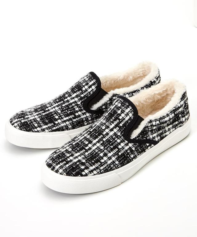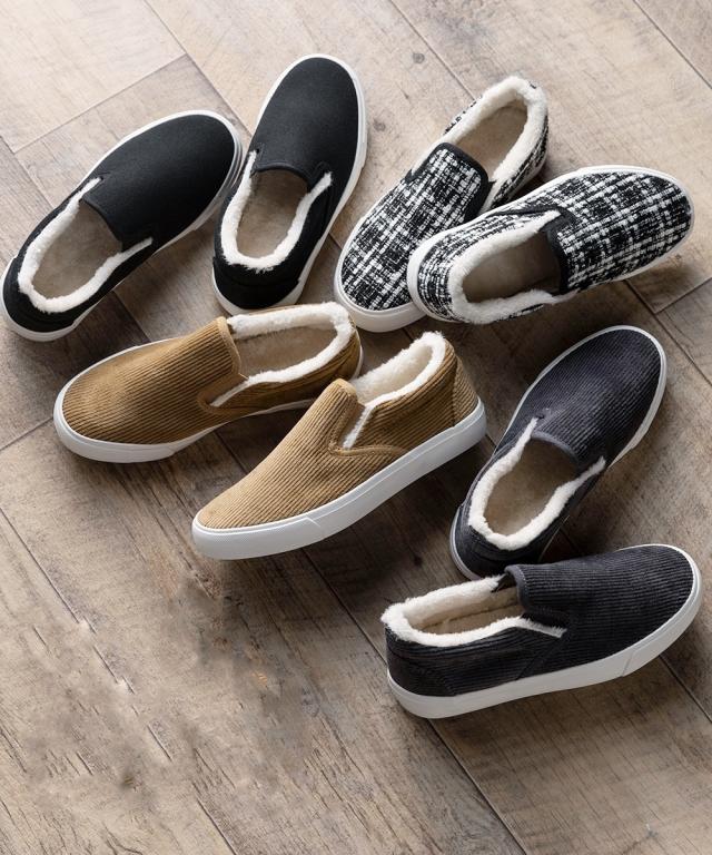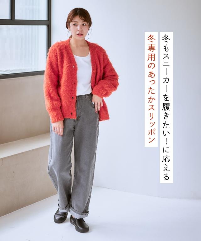 [keyword] 靴 レディースシューズ バッグ アクセサリー ローヒール ぺたんこ フラット 楽ちん 疲れにくい 低い かかと 3E ラウンドトゥ つま先が丸い おしゃれ あったか 冬 防寒 ファー 素材 合成皮革 無地 無地調 柄 かわいい チェック ベーシック シンプル 定番 着回し [comment] 内側はつま先までしっかりファーで履くだけ即ぬっくぬくな冬仕様のスリッポン。 スウェード調、コーデュロイなど足元にさりけなく季節感をプラス。 ゆったり3E、かかとをしっかり包み込むよう深さを改善するなどこだわり設計で履き心地も 。 黒スウェードのファーはレオパード柄使い。脱いで見せたくなる可愛さです。