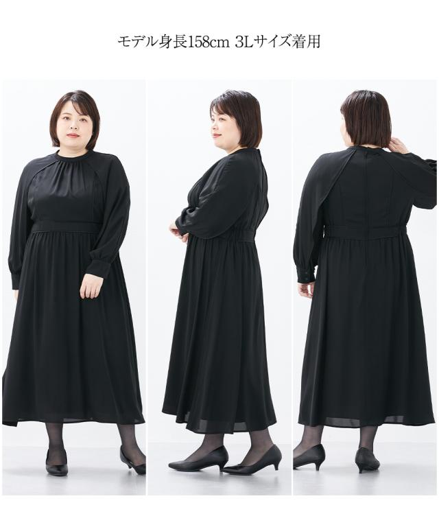 喪服 礼服 ワンピース 大きいサイズ レディース Callarus 洗える 防しわ サテンパイピング デザイン スタンドカラー 黒 4L/5L/6L フォーマル セレモニー ニッセン nissen
