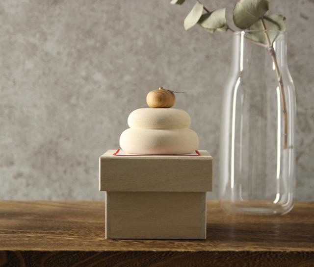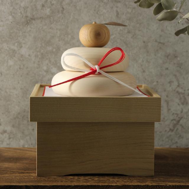 | 素材 | 鏡餅:国産イチョウ、橙:国産けやき、葉:国産黒柿、収納台:桐 |
