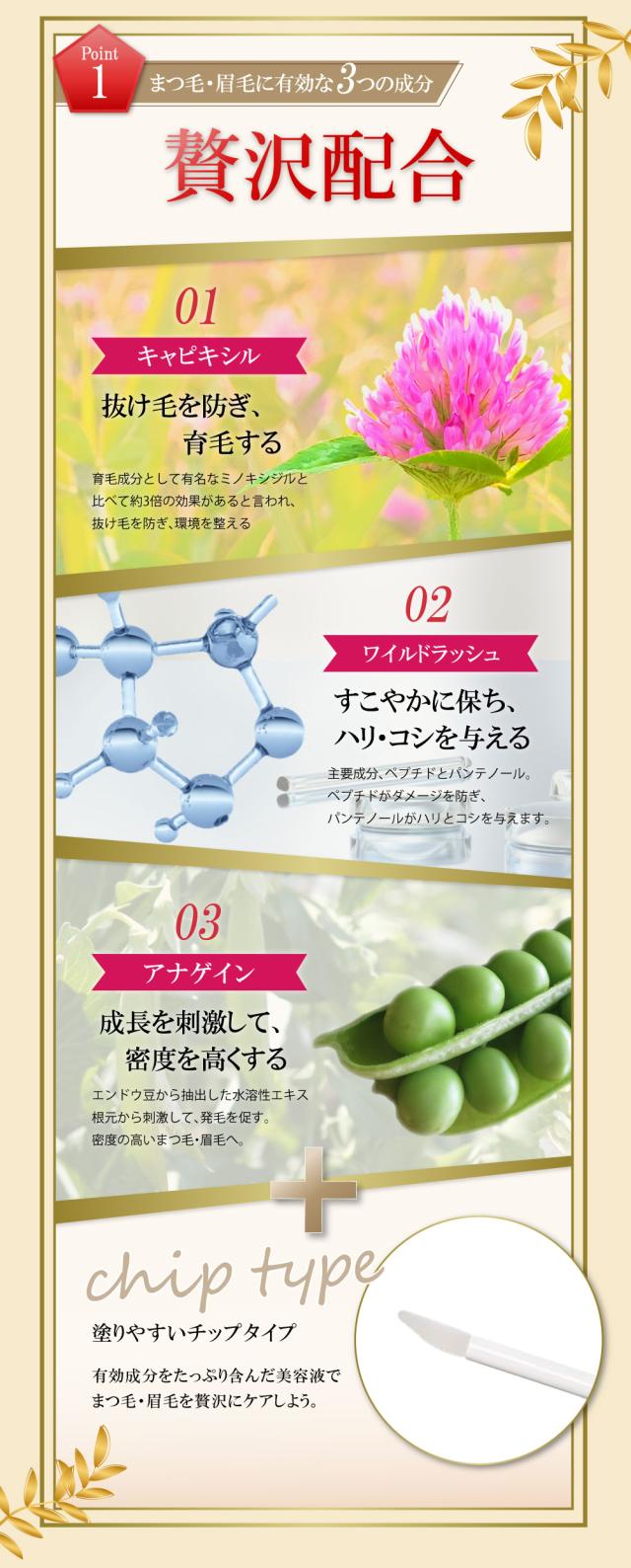 (※2)キャピキシル(アセチルテトラペプチド-3とアカツメクサ花エキスの混合物)、ワイルドラッシュ(ビオチノイルトリペプチド-1とパンテノールの混合物)、アナゲイン(エンドウ芽エキス)