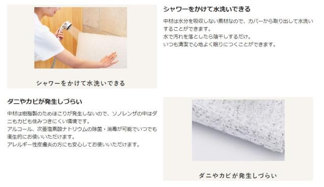 また、水分を吸収しない素材のため、水洗いが可能で乾きも早く、カビやダニの発生が抑えられ、清潔にお使いいただけます。