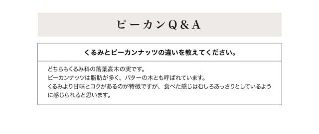 - こちらのピーカンナッツとても美味しいです。ローストの加減も良いですし、味もコクがありつい食べ過ぎてしまうほどです。