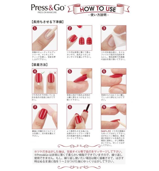 自爪に合ったPress&Goを選んでください。もしサイズが合わない場合はネイルファイルを使ってサイズを調整してください。装着前にはプッシャーで甘皮を押し上げてください。