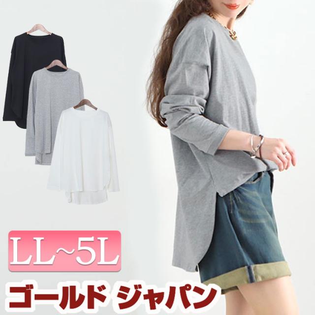 秋新作 大きいサイズ レディース トップス カットソー ラウンドロングヘムカットソー 長袖 ロング スリット クルーネック ストレッチ 伸縮 ドロップショルダー ラウンドカット コットン 綿 秋服 春服 LL 2L 3L 4L 5L ブラック 黒 オフホワイト 白 杢グレー ゴールドジャパン