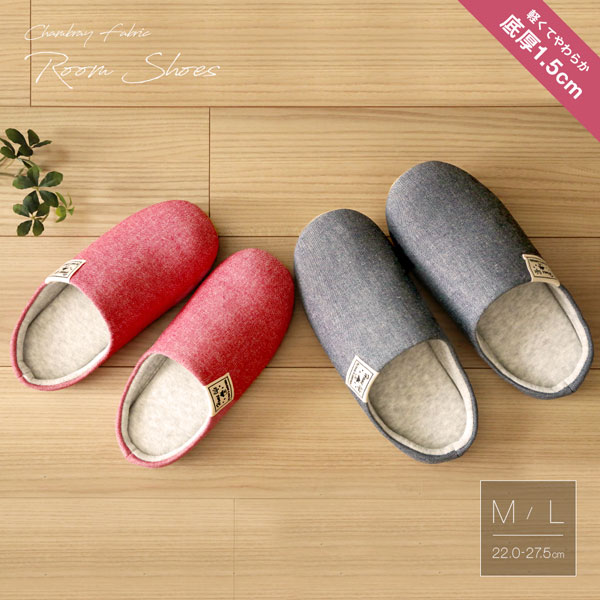 | つま先上がりフォルムで、小さな段差につまづきにくい!おしゃれなシャンブレー生地のルームスリッパです。底厚約1.5cmのクッションが軽くてやわらかな履き心地。かかと部は浅く包み込む形状で脱ぎ履きしやすく、滑り止め付き。 | |
