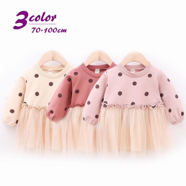 ドッキングワンピース ベビー 赤ちゃん キッズ 長袖 ラウンドネック ギャザー フリル フレア チュール 透け感 ドット 水玉