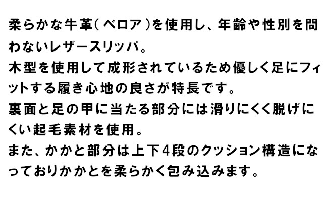 柔らかな牛革(ベロア)を使用し、年齢や性別を問わないレザースリッパ。 |