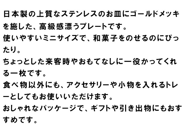 日本製の上質なステンレスのお皿にゴールドメッキを施した、高級感漂うプレートです。