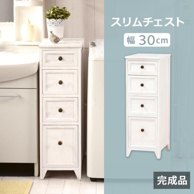 完成品 木目を生かしたアンティーク塗装 天然木 スリムチェスト 4段 幅30 【送料無料】 木製 フレンチカントリー おしゃれ ホワイト 白 スリム すき間収納 小引き出し 収納 洗面所収納 かわいい インテリア 家具