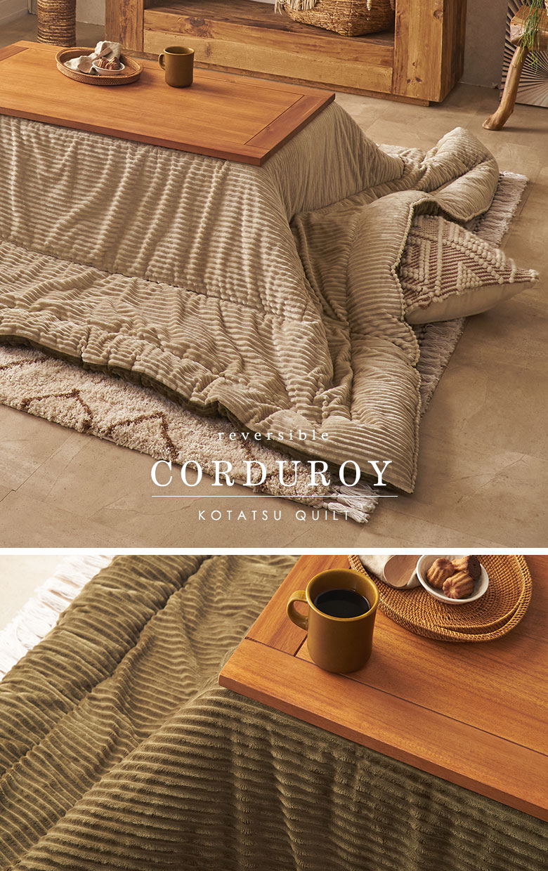両面コーデュロイで、リバーシブルで使えるこたつ布団。インテリアやテーブルの天板に合わせて好きな色を表にして、お部屋の雰囲気を簡単チェンジできます。コーデュロイ素材はやわらかな質感と高い保温性で、寒い季節も快適であたたかに過ごせそう。洗濯機で洗えるので、小さなお子様やペットがいるお家でも安心です。
