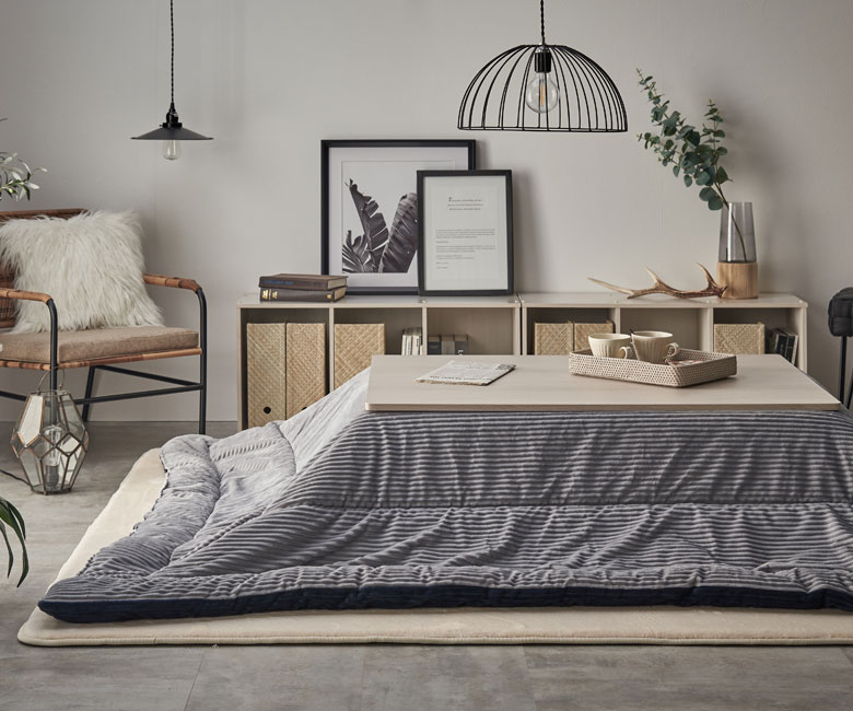 こたつ布団にありそうでなかったスタイリッシュさを取り入れた、こだわりのカラーリング。あたたかさはキープしつつ、こたつ布団によくあるモコモコ感をなくし、すっきり見える“ちょうど良い”厚みにもこだわりました。