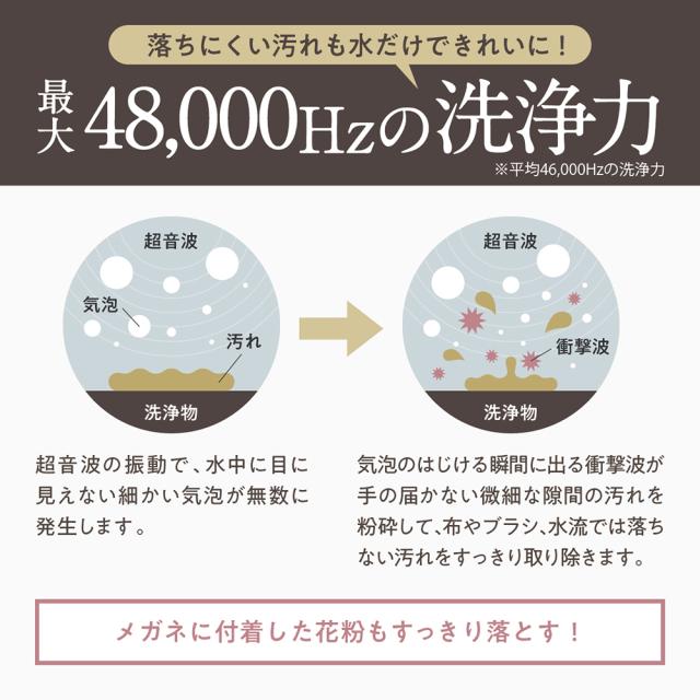 最大48,000Hzのパワフルな周波数で落ちにくい汚れも水だけできれいになります。超音波の振動で、水中に目に見えない細かい気泡が無数に発生します。その気泡のはじける瞬間に出る衝撃波が手の届かない微細な隙間の汚れを粉砕して、布やブラシ、水流では落ちない汚れをスッキリ取り除きます。メガネに付着した花粉もすっきり落とすのでおすすめです。※平均46,000Hzの洗浄力。