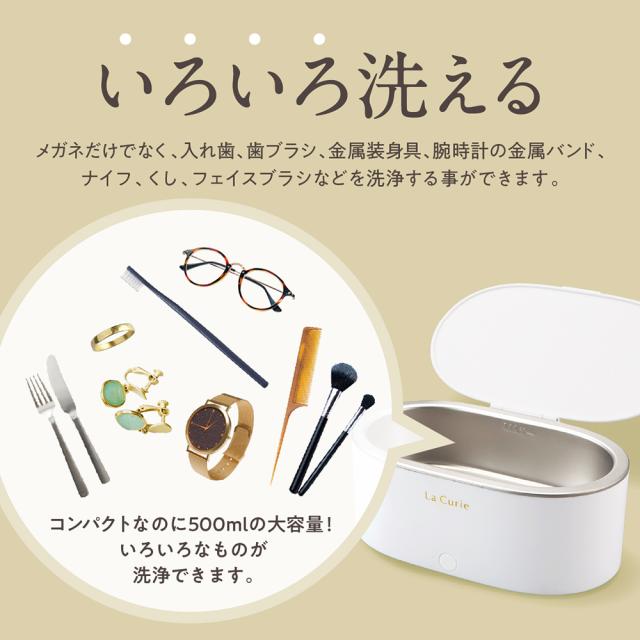 500mlの容量があるので、いろいろなものが洗浄できます。メガネだけでなく、入れ歯、歯ブラシ、金属装身具、腕時計の金属バンド、ナイフ、くし、フェイスブラシなどを洗浄する事ができます。