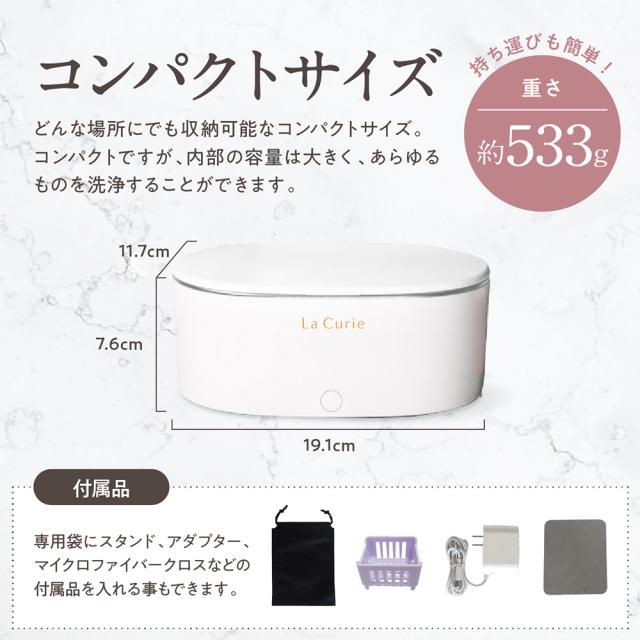 コンパクトサイズですので、どんな場所にでも収納できます。約533gの重量なので、とても軽量で持ち運びも簡単です。コンパクトですが、内部の容量は大きく、あらゆるものを洗浄することができます。専用の袋もあるのでスタンド、アダプター、マイクロファイバークロスなどの付属品を入れる事もできます