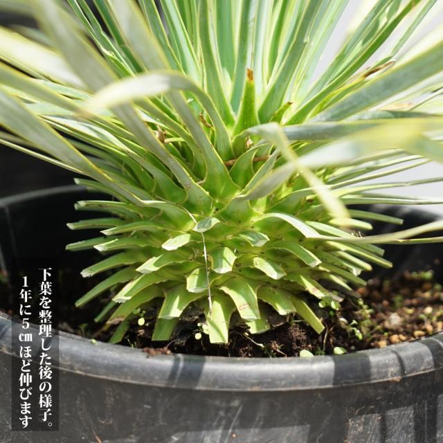 50度からマイナス10度の砂漠地帯でも逞しく育つメキシコ原産の丈夫な植物です。シルバーグリーンの綺麗な葉と、育つごとに魅力が増すうろこ状の独特な木肌。大きく育つまでには長い年月が必要ですが、年齢を重ねた幹はシンボルツリーにもぴったりです。