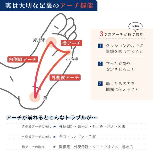 人間の足の裏には3つのアーチがあり、親指のつけ根・小指のつけ根・かかとの3点を結ぶ形で体のバランスを保っています。