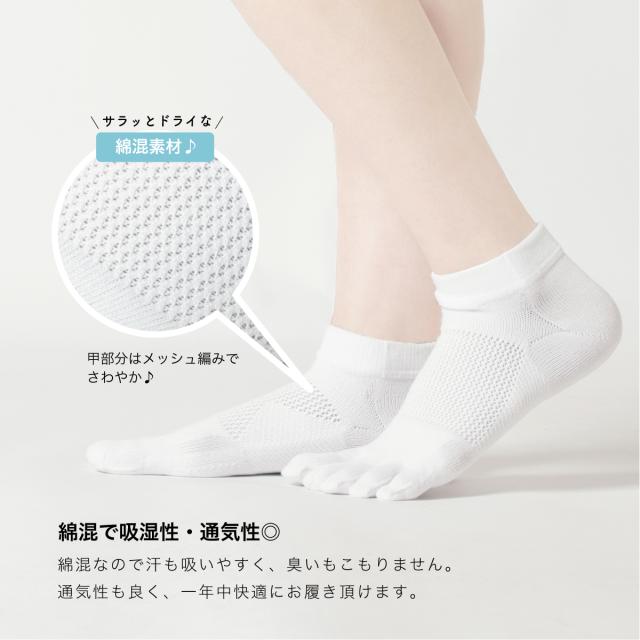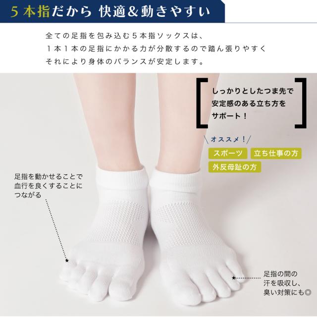 全ての足指を包み込む5本指ソックスは、指の間の汗も吸収しムレにくくなります。