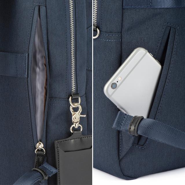 | 通勤に最適なスクエア型のスリムで機能的なビジネスリュック。 コンパクトなフォルムながら収納力もあり、ビジネス仕様の機能性を備えています。 ● カジュアル感もありながら、きれいなメランジ素材を使用 ● メイン収納部は荷物が出し入れしやすいシンプルな内装 ● A4ファイルが収納可能(参考収納寸法31.3×23.1 cm) ● 13.3インチPC収納ポケットを搭載※1 ● メイン収納部にはボトルホルダーを搭載(※保冷・防水機能はありません。) ● 小物雑貨を収納できる内装オーガナイザーポケット ● 前持ち時に同じ空間に左右から物の出し入れが可能な「ダブルアクセスポケット™」 ※2 ● 背面にスマートフォン専用ポケット「スマートアクセスポケット™」※3を搭載 ● アクセントにもなっている着脱可能なカードホルダー ● セキュリティ性の高い背面ファスナーポケット ● 薄いパッドが入り、滑りにくく、疲れにくい仕様のショルダーベルト ● スーツケースなどのハンドルに固定し走行時のバッグのふらつきを防ぐセットアップ機能 ※1 参考収納寸法 W31×H22×D2.5 cm ※2 「ダブルアクセスポケット™ 」前持ち時に、同じ空間に左右から物の出し入れが可能なポケット ※3 「スマートアクセスポケット™」素早く出し入れできて滑り落ちにくい構造のスマートフォン専用ポケット |