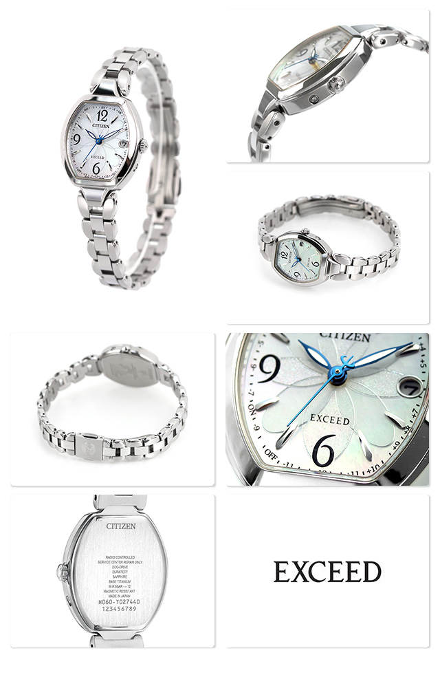 正規品 7年保証キャンペーン 送料無料 シチズン エクシード エコ・ドライブ電波時計 ティタニアハッピーフライト チタン 電波ソーラー 日本製 エコ・ドライブ電波 レディース 腕時計 ES9480-56W CITIZEN EXCEED Eco-Drive Titania Happy Flight アナログ ホワイトシェル ◆確かな品質と洗練されたデザインによって唯一の価値を生み出す。シチズン エクシードは、まさに「本物」を求める大人にふさわしい時計です。 優雅なデザインが人気のフラワーバンド、トノー型モデルがハッピーフライト機能を搭載して登場。ケースからバンドへつながる、花びらのような軽やかで優しいラインも魅力的なデザインに、簡単な操作で世界24都市の時刻に修正できる「ハッピーフライト」を搭載しています。また、美しい白蝶貝の文字盤を採用。エッチングパターンを施し、ひときわエレガントに仕上げています。スーツスタイルから、休日の大人カジュアルまで幅広く合わせることができます。 発売日:21年11月発売