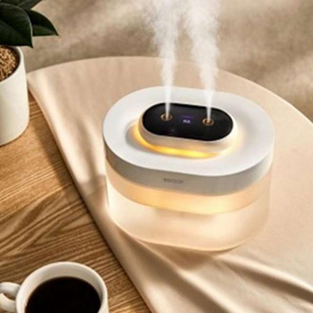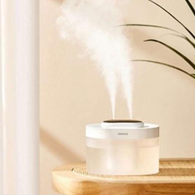 超音波式加湿器。タンク容量1L。ライト点灯モード。加湿量50/100ml。