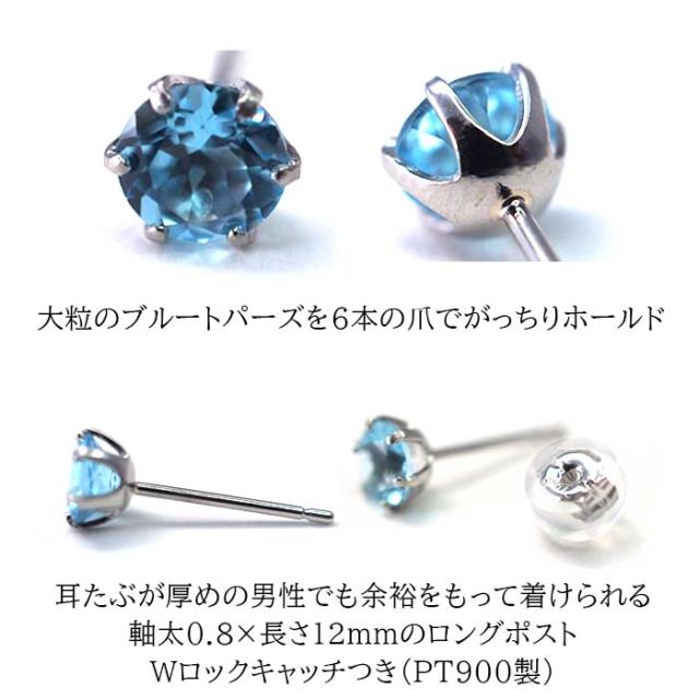 | セカンドピアス つけっぱなし プラチナ PT900 ブルートパーズ 5mm 大粒 ピアス 金属アレルギー対応 軸太 ロングポスト 特針タイプ |