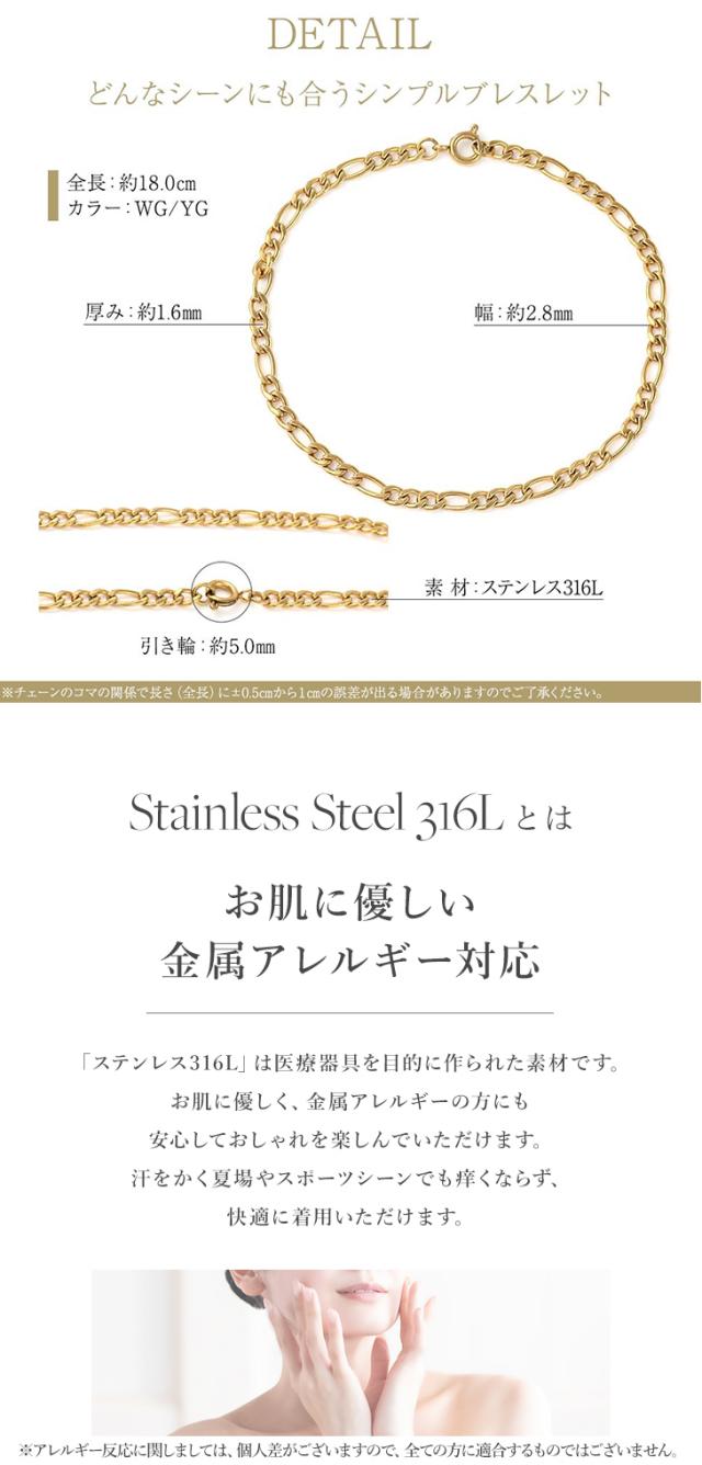 上品な輝きの美しいエレガントなチェーンブレスレット。艶感のある細めの地金がしなやかに動き、女性の手首を華奢に細く見せてくれます。シンプルなデザインで、重ね付けや、ネックレスやピストとのセットアップジュエリーとしてもおすすめです。「 ステンレス 316L 」は金属アレルギー対応で、お肌に優しく安心です。