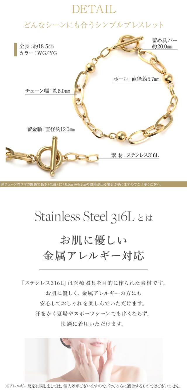 上品な輝きの美しいエレガントなチェーンブレスレット。艶感のある太めの地金が存在感抜群、女性の手首を華奢に細く見せてくれます。シンプルなデザインで、重ね付けや、ネックレスやピストとのセットアップジュエリーとしてもおすすめです。「 ステンレス 316L 」は金属アレルギー対応で、お肌に優しく安心です。